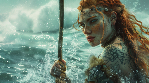 red haired viking weaved braided hair many tattoos on face and body sea druid plain wise mid 20's in age human female wearing simple hides and furs ocean sea colors high fantasy art style carrying a staff in one hand looking to her right background of sea and ocean spray portrait --ar 16:9 --v 6.0