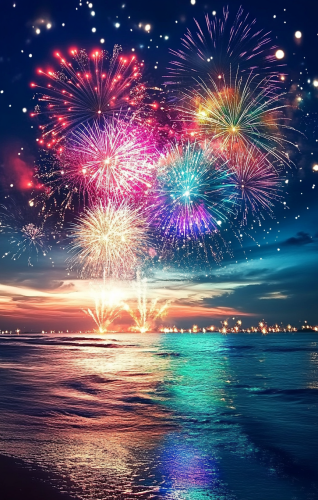 A stunning photograph of fireworks illuminating the night sky over an endless sea, with distant lights twinkling on both horizons. The focal point is the large-scale display of colorful firework explosions, set against a deep blue background. This scene captures a sense of grandeur and celebration, perfect for adding dynamic elements to your mobile phone wallpaper. --ar 7:11