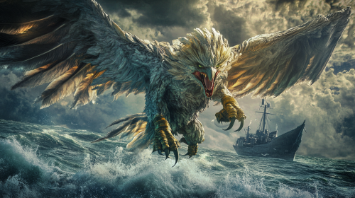 PerendiaEshte Today at 12:21 PM full body portrait, monstrous female winged harpy, flying, snarl, medieval dreadnought at sea background, daylight colors, --ar 16:9 --v 6.1