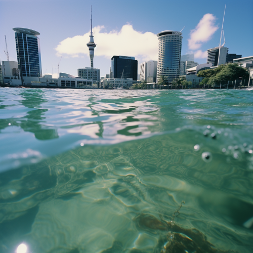 Auckland CBD under water due to sea level rivels have risen 2050, show Auckland wharf and hilton hotel under water, Make Photorealistic, ultra high definition, canon 50mm, kodachrome.