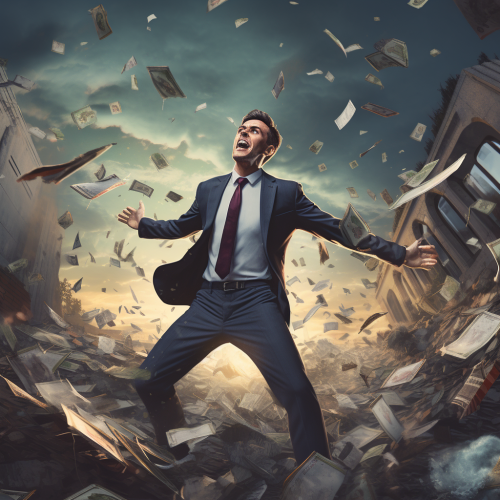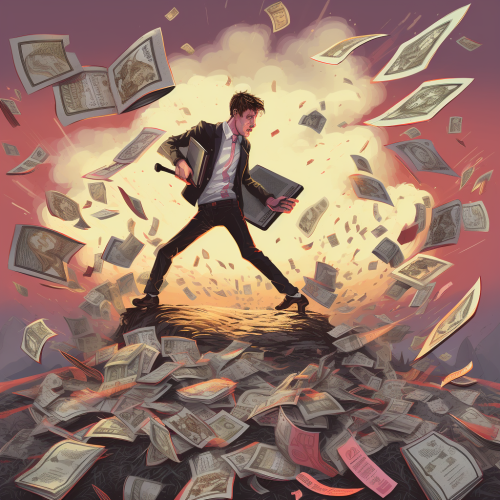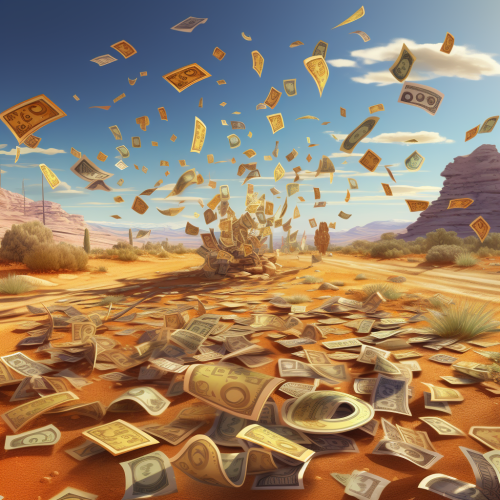 Using HD Hyperealistic Pixar style show a financialdebt super cycle with financial instruments and dollars swirling over a barren landscape