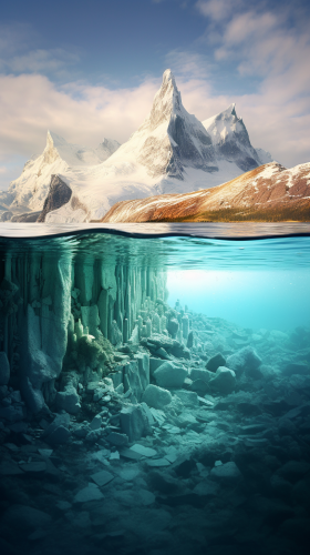 A hyperrealistic photo explaining how Glaciers melting into the oceans during the ice age raises sea levels and flooding land. Cold colours, surrealistic --ar 9:16