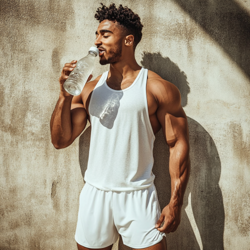 Capturere full wide angle photo.Glossy Image of athlete drinking a bottleof water withtop off and no label, happy, gym, full body dressed in white tank ttank. Baby gym shorts or joggers --v 6.1