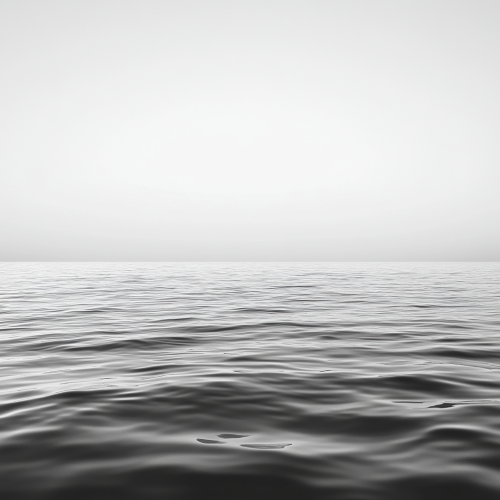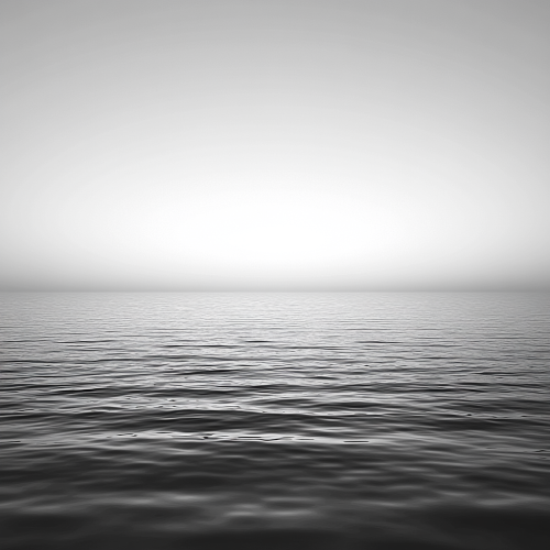 A placid water surface reflecting light, set against a gradient background transitioning from grey to white. The scene has a high contrast, captured with a CANON FD 14mm T2.9 GL Optics lens on a BMPCC 6K Pro camera. Directed by Gabriel Moses. Cinematic wide aspect ratio (16:9). –ar 16:9 –v 6.0