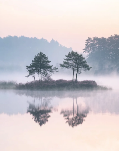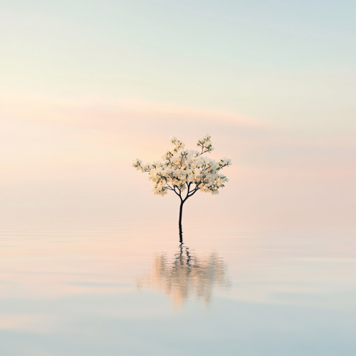 A minimalist photograph of an isolated, small tree with white flowers growing in the middle of calm water, with a pastel sky background and a reflection on the surface. High-resolution photography, high definition