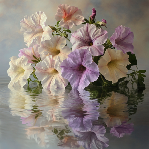 Visualize in the foreground a bouquet of mature petunias and some beginning to wither in soft colors, in a delicate composition in the first moment of touching a surface of water where white predominates, photographic realism, ultra high definition