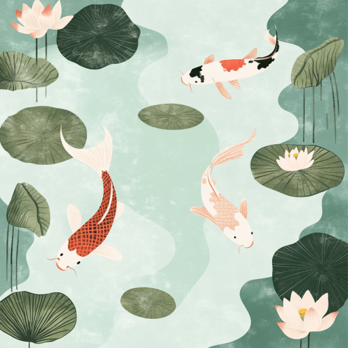 Create a flowing design of stylized Japanese gardens, with subtle hints of water lilies, koi fish, and lotus flowers. Use organic, abstract shapes in soft pastel hues like pale greens, pinks, and blues, evoking a tranquil, minimal aesthetic
