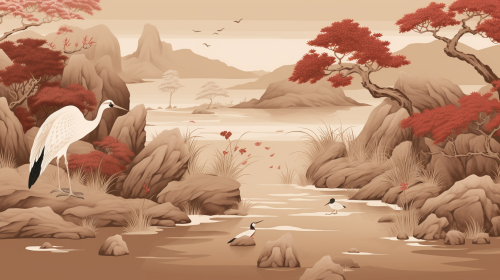 "Serene Oriental Garden with Zen Stones, Garzas, and Flowing Water on Sand Base": An elegant and serene oriental wallpaper featuring a zen garden with stacked stones, delicate garzas (cranes), and flowing water details, all in a refined maroon-red (Pantone 19-1537 TCX) over a sand background (Pantone ECE4D7). The cranes stand near water and stones, creating a tranquil and balanced scene. --ar 16:9 --v 5.0