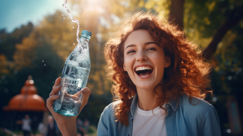a photo of amazed happy woman at the park, drinking bottle of mineral water, photorealistic --ar 16:9 --v 5.2