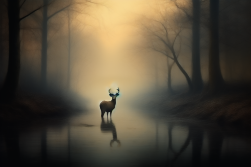 a deer drinking water from river, landscape, evening, gloomy, very soft focys, mysterious --ar 3:2 --stop 70