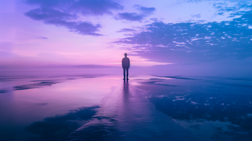 An inspirational thumbnail. The person standing at the edge symbolizes balance and introspection. Use of soothing blues and purples to evoke tranquility. Created Using: emotional resonance, reflective water imagery, bold and readable overlay text, tranquility-inspired color palette, metaphorical visual, clear focus, high contrast for text readability, hd quality, natural look --ar 16:9 --v 6.0
