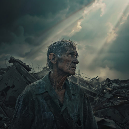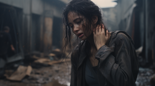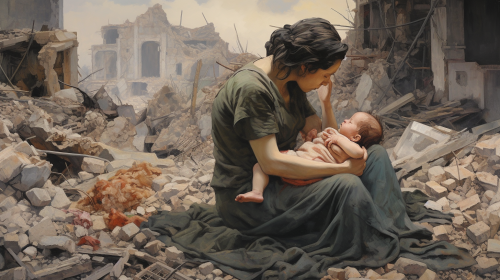 A city that was destroyed in the war, a bird's-eye view of a mother holding a child on the ground, the mother and child lying down, the mother and child made of stone and building debris. Be realistic with high quality--s 250 --ar 16:9