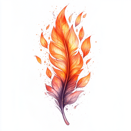 A tattoo-style illustration of a single feather transforming into flames, inspired by the symbolism of the phoenix. The feather begins in soft, delicate detail at the base and gradually transitions into flowing flames towards the tip, symbolizing rebirth, resilience, and transformation. The design combines intricate feather textures with dynamic flame patterns, creating a balanced blend of softness and intensity. The background is minimal to highlight the transition from feather to fire, giving it an empowering, timeless look. --q 2 --s 750