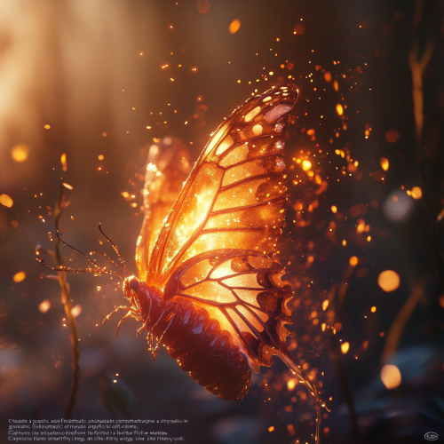 "Create a poetic and cinematic scene featuring a chrysalis engulfed in soft, glowing flames. The flames illuminate the intricate details of the chrysalis as it transforms into a butterfly. Capture the delicate emergence of butterfly wings from the fiery cocoon, symbolizing rebirth and freedom. The background should be an ethereal landscape with warm, dreamy colors blending harmoniously, enhancing the magical atmosphere. Add subtle sparks and embers drifting in the air, evoking a sense of wonder and transformation."