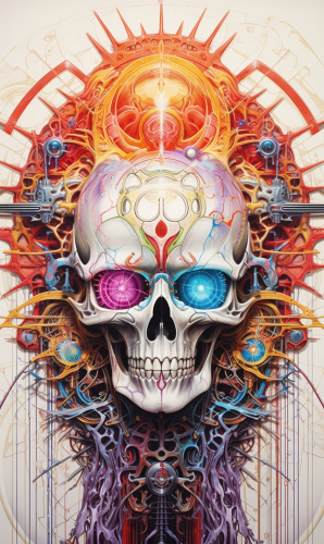 Create a highly detailed tattoo design that represents spiritual transformation and connection between different worlds or dimensions. The design should include a central symbol of death and rebirth, such as a stylized skull or phoenix, to represent the release of old identities and the beginning of a new journey. Incorporate flowing lines and abstract patterns to symbolize the merging of different energies or realities. Include geometric shapes, such as sacred geometry or mandalas, that convey spiritual growth, balance, and interconnection. The color palette should focus on white, silver, and muted tones with hints of electric blue to represent purity, connection, and activation. The overall design should be dynamic, realistic, and harmonious in style, invoking feelings of healing, transformation, and deeper spiritual awakening.