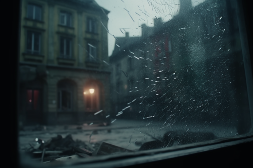 detail on broken glass in, full screen detail, ruined city as reflaction, dark night, only flares light, red light from flying flares, red lights at night, Warsaw uprising, boombing, Wajda movie style, ruins, dust, clouds and fog vfx --ar 3:2 --stylize 250 --v 5.0