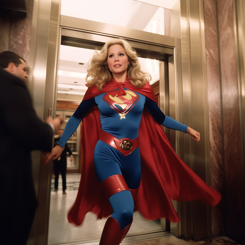 christina applegate as claire kent running through a building's revolving door at super speed transforming into superwoman in her iconic red and blue uniform in the 1978 movie realistic