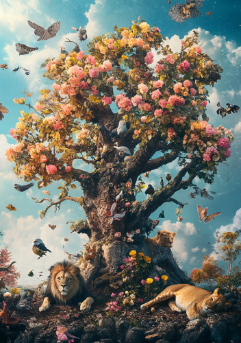 photograph image 4k detailed of a majestic tree at the center, with branches sprawling out and different animals perched or interacting around it bees buzzing around flowers, an owl in a branch, a lion resting under the shade. --ar 7:10