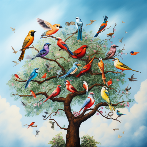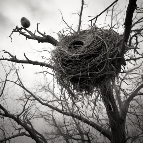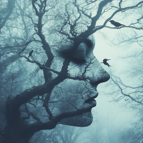 negative space background, deep misty woods, face in the shape of a tree, birds shaped like eyes and nose, branches shaped like mouth surreal--style raw --v 6.1 --s 250