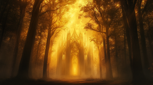 beautiful ethereal image of a cathedral made of of trees, towering tree cathedral, atmospheric, hauntingly beautiful image, mysteriius, backlit --ar 16:9