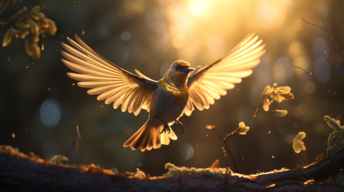 cinematic, a bird landing on a tree branch, golden feathers glistening in the sun, light art, 8K --ar 16:9