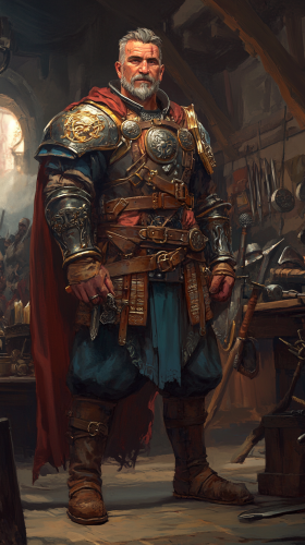 A veteran warrior and master weaponsmith with a strong, muscular build and broad shoulders. He has short, graying hair with a neatly trimmed beard, and kind, piercing blue eyes that show wisdom and experience. His face is warm, with a gentle smile that hints at both strength and compassion. Dressed in custom-forged leather and metal armor with intricate designs, he carries a blacksmith's hammer and a sword at his side. His armor is worn but well-maintained, and he wears a rugged but friendly cloak. His presence is imposing yet approachable, exuding calm and trustworthiness. In the style of a Disney character, colorful with a heroic and charming edge, standing confidently in his forge surrounded by weapons and tools. --ar 9:16