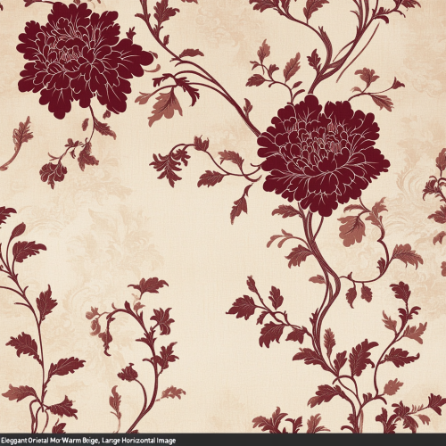 "Elegant Oriental Motif on Warm Beige, Large Horizontal Image": A large, wide-format oriental wallpaper design featuring intricate floral and vine motifs inspired by East Asian art. The background is a soft, warm beige (Pantone ECE4D7), with detailed patterns in a rich, earthy maroon-red (Pantone 19-1537 TCX). The design includes repeating floral elements, delicate mandalas, and interwoven vines across a panoramic layout, creating a sophisticated look for expansive walls.
