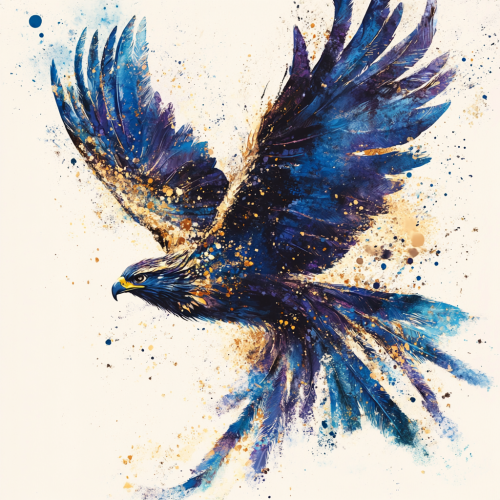 A majestic and graceful design of a large bird, like an eagle or phoenix, with feathers gently falling around it. The bird should have a powerful yet elegant presence, with detailed wings spread wide. Incorporate a spilled paint aesthetic with vibrant colors like blue, gold, and white, with splashes and drips that merge into the feathers and background. The falling feathers should appear to dissolve into paint splatters as they descend, adding a dynamic and artistic touch. The overall design should be visually striking, modern, and optimized for DTG printing, evoking a sense of freedom and majesty.