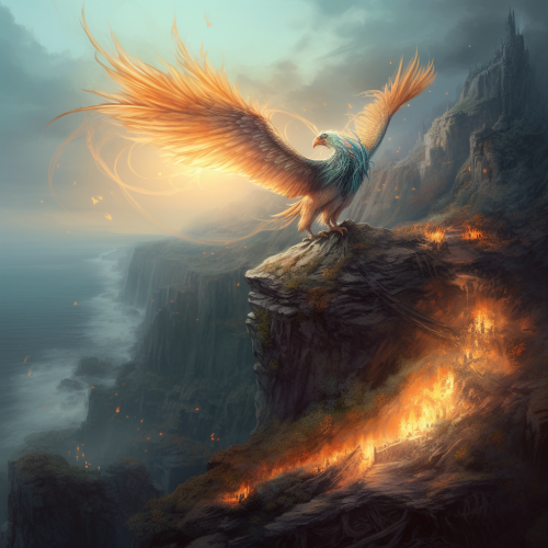 digital art, fantasy world, cliffside scene, large feathered bird beast, a feathered dragon breathing fire, large wings and plumage --v 5.0