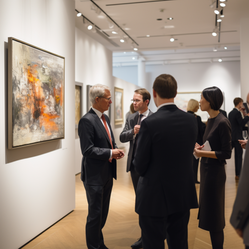 A professional photograph of distinguished business men and women standing observing art at a prestigious art gallery. The men and women represent a mix of backgrounds, from Asia to Africa to Europe. Their clothing, from tailored suits to luxury watches, signals their immense wealth and success. They exude confidence and authority, with some actively engaged in conversation and others listening thoughtfully. The photograph is taken from a slightly lowered angle, emphasizing the stature and dominance of the individuals. The shot perspective is from offering a comprehensive view of the gallery and its occupants. This viewpoint provides the sensation of an observer, possibly someone recently admitted to this realm of influence. The image is captured using a high-quality DSLR camera, specifically a Canon EOS 5D Mark IV, paired with a Canon FF 16.35mm f/2.8L III USM lens. Natural daylight illuminates the scene, showcasing the details in their raw essence. The composition adheres to a 16:9 aspect ratio, delivering a professional-grade photograph.--raw