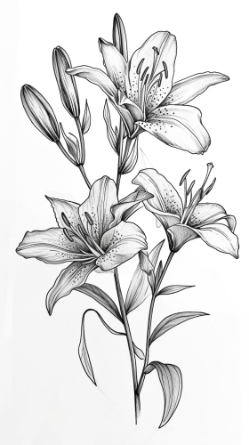 You would like an image of lilies drawn with a pen and brush, featuring strong and weak lines for a simple yet powerful effect. The artwork should be in black on white paper, with the exception of one of the flower buds, which should have a feminine, watercolor-like touch of color. There should be three lilies arranged vertically: one fully bloomed, another partially opened, and the third just as a bud. Additionally, the leaves at the base of the flowers should be entwined with both thick and thin lines for added emphasis. Let's create this image. You're requesting an image that is both sensual and sophisticated in its depiction. --ar 9:16 --v 6.0 --s 50 --style raw