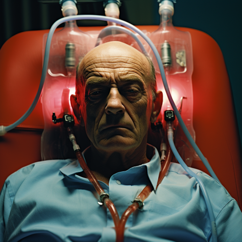 Mark Margolis as Hector Salamanca in his weelchair, oxygen tube on his nose, realistic to Breaking Bad, closeup portrait, UHD, telephoto lens, color film, from a high angle, with a feeling of power and menace, neon lighting background with color of red and electric blue, in a hospital room, gelatin metallic print, s 750, ar 35:44