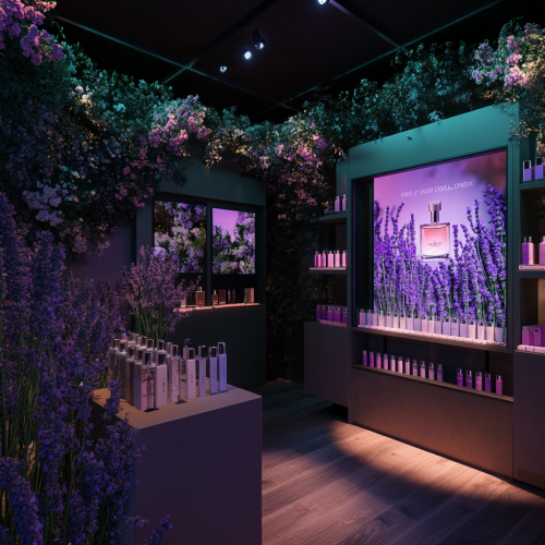 Advertising event in which a sensory experience is created for a perfume brand. In this space, we see a dominant color of minty green, lavender, bergamot and oak flowers and people. We also see screens with reference images for the perfumes. We also see shelves with products, in this case perfumes. 4K