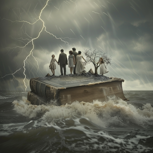 Friendly family, standing on giant bible, floating in ocean, photo, rough seas, lightning in sky, four men wives and kids behind them, family tree lined up in distance