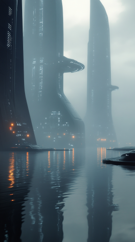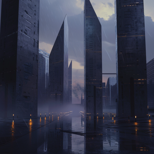a hyper-realistic image of a dystopian cityscape during twilight. The scene features towering symmetrical megastructures with geometric precision, made of dark, weathered concrete and steel. The sky is a deep indigo, reflecting off the large glass surfaces of the buildings. Sparse, dim lights flicker in some of the building windows, suggesting sparse habitation. The streets are deserted and wet from recent rain, reflecting the buildings and the dim lights. The atmosphere is thick and heavy, evoking a sense of oppressive solitude. Render this scene in ultra high definition 8K resolution. --v 6.0