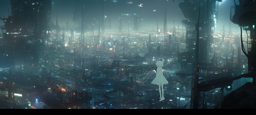 A highly detailed, ultra-high-definition dystopian scene of a cityscape that stretches to the horizon, with towering buildings reaching all the way into space. It’s midnight, and the city is in total blackout, creating a dark, eerie atmosphere. A lone 16-year-old girl, appearing as an angel with white wings, gracefully flies above the city, wearing a simple white dress that softly flows in the night breeze. The angel is illuminated softly against the deep night sky, creating a sense of calm amidst the darkness. The image features intricate details, with precise, meticulous line work and textures, rendered in 4K resolution. In the distant sky, faint glimmers of stars can be seen breaking through the dark clouds, adding a subtle hopefulness to the dystopian scene. --ar 20:9 --p xwfri5q --niji 6