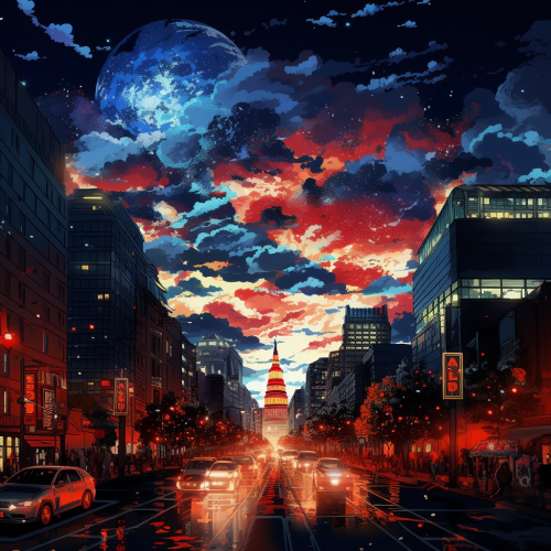 a cartoon anime cityscape of Washington d.c., super american vibes, so american its funny. fireworks and bombs, guns and war, flames. bright neon colors, so many colors, dark dystopian cyberpunk art style, 8k image quality hi defintion cartoon --ar 3:2