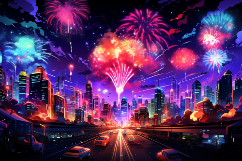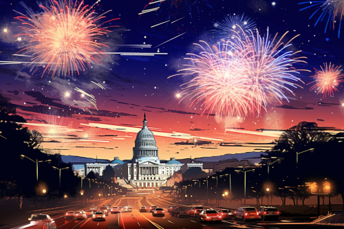 a cartoon anime cityscape of Washington d.c., super american vibes. fireworks and bombs, guns and war, flames. bright red, white, blue, yellow neon colors, dark dystopian cyberpunk art style, 8k image quality hi defintion cartoon --ar 3:2