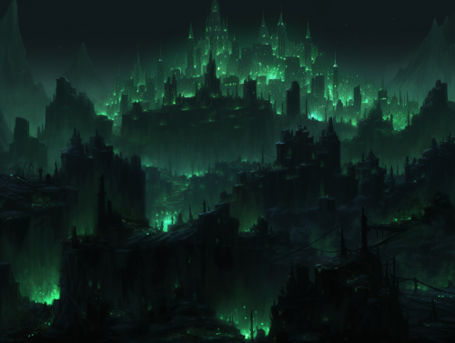 dark gothic city overgrown with toxic green crystal, warhammer 40k, detailed, in the style of dark science fiction --ar 4:3 --niji 5 --s 50