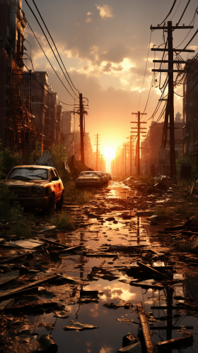 a real photo of a deserted city in the style of "The Last of Us", eerie, hopeless, no electricity, broken signs, nature reclaiming the place, sunset, highly detailed --ar 9:16 --no humans --stylize 750