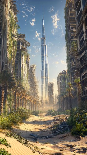 A futuristic Dubai in the year 2100, abandoned by humans and overtaken by nature. The towering Burj Khalifa stands in the distance, its once-glass surface now cracked and covered in sand and vegetation. The city's futuristic skyscrapers are partially collapsed, with vines and greenery creeping up their sides. The desert has begun to reclaim the urban landscape, with dunes encroaching on the once-busy streets. The iconic Palm Jumeirah is barely visible under layers of sand and plant life. The atmosphere is eerie and desolate, with no signs of human life, just the silent, decaying remnants of a once-glorious city. --ar 9:16