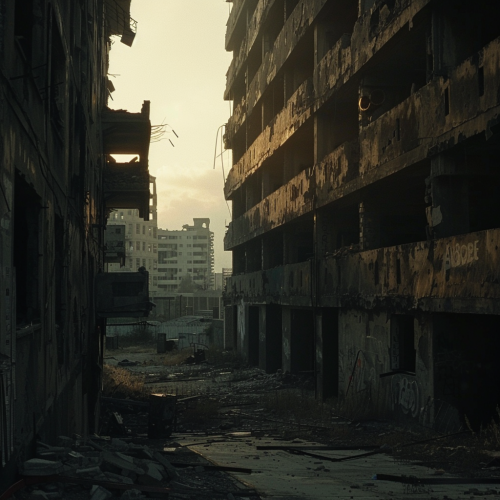 Detailed image of dark, deserted dystopian cityscape in 8K.