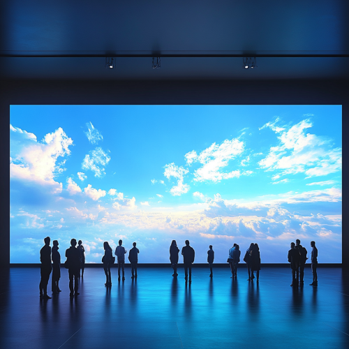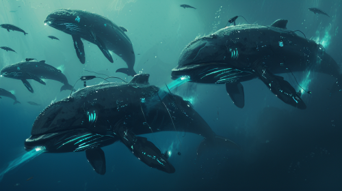 Envision a vast digital expanse, captured through the lens of Wolfgang Tillmans’ blended macro-micro perspectives. A vast digital ocean stretches to the horizon, its muted blues contrasted sharply by neon-lit human silhouettes swimming gracefully in synchronized harmony. As the focus shifts, the fine details of each silhouette become clearer, yet the sense of the collective never diminishes. The muted depths of the ocean play against the vibrant neon figures, a hallmark of Tillmans’ contrasting color dynamics. Capture this moment as if it’s both ephemeral and eternal: a fleeting moment of unity in the digital age yet timeless in its portrayal. Let the photo be alive with movement, embodying the fluidity of a collective, with every figure playing a part in the grand choreography of the digital human collective. The image should evoke both the raw energy of individual identities and the serene beauty of collective unity.