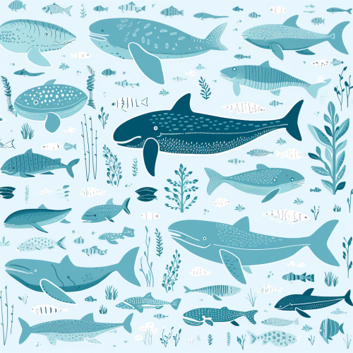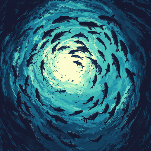 Underwater sea with fish shoals bottom view. Vector background with vortex (show proper vortex) of ocean silhouettes creates mesmerizing sight, showcasing beauty and diversity of marine life, illustrations