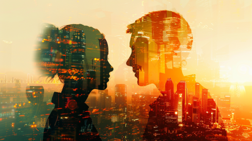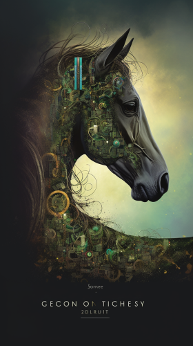 A mesmerizing book cover featuring a graceful silhouette of a human leader and a majestic horse, walking side by side through a lush digital landscape filled with circuitry and greenery. The leader's hand touches the horse's mane, symbolizing harmony and unity. The AI, photorealistic photography with a 50mm prime lens, capturing intricate details and vibrant colors, --ar 9:16 --v 5.0