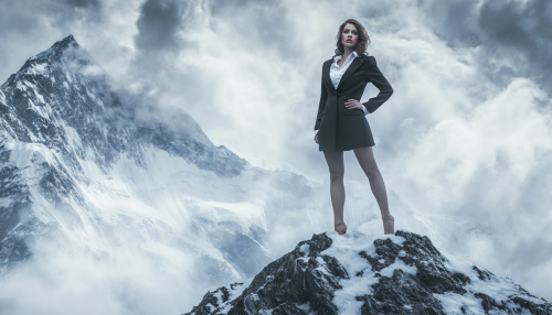 Fashion shoot for clothes, a well dressed female lawyer , is standing barefoot on top of the mount everest,sunny weather, 65 mm, photorealistic, fashion photo shoot for Vogue magasine, uhd image, 8k, in the style of saturated colorism, --ar 7:4 --style raw --stylize 50 --v 6.1