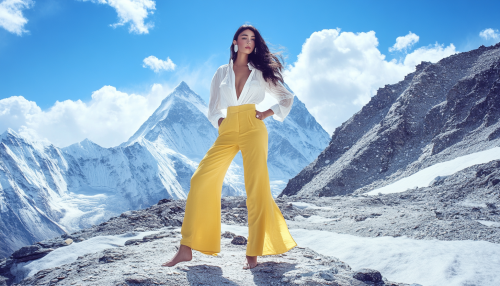 Fashion shoot for clothes, an elegant beautiful woman dress in light summer clothes, pants and shirt, is standing barefoot on top of the mount everest,sunny weather, 65 mm, photorealistic, fashion photo shoot for Vogue magasine, uhd image, 8k, in the style of saturated colorism, --ar 7:4 --style raw --stylize 50 --v 6.1