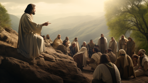 Generate a hyperrealistic and mystic image for a Christianity video, illustrating the Sermon on the Mount with golden accents. Utilize state-of-the-art digital art techniques to render Jesus and the disciples with lifelike precision, adding golden highlights to convey the wisdom and spirituality of the moment. Apply an aged page texture with golden undertones for a perfect blend of hyperrealism and divine elegance, --ar 16:9 --v 5.0