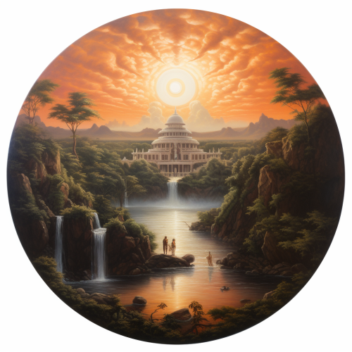 oil painting, marble white old circular temple, on a hill, disciples listen, master sitting, surrounded by forest and ponds, water lilies, red sunset, dream-like