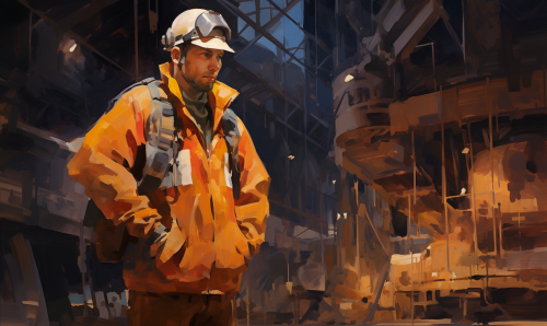 Disco elysium styled, two engineers in construction helmets, background - gas station, construction, engineering structures, cinematic lighting, oil painting, broad strokes, --ar 5:3 --v 5.2